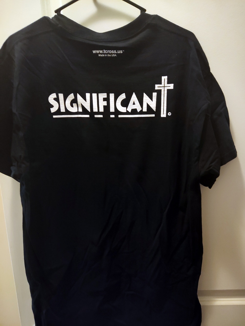 Significant Faith based tee shirts, black or pink; white lettering on front and back, made in USA from thick, sturdy material. Machine washable, sizes M, L, and XL in men's and women's sizes.